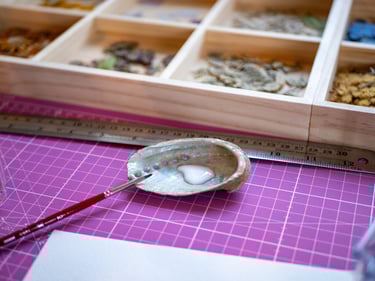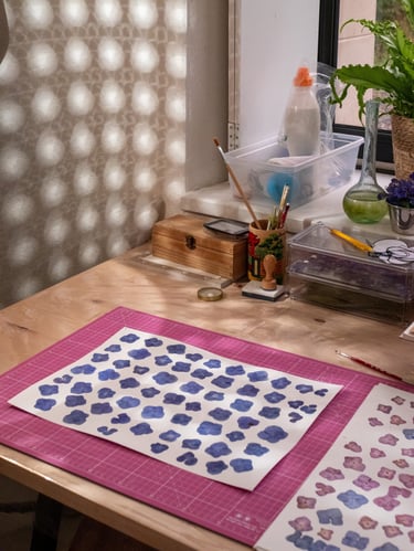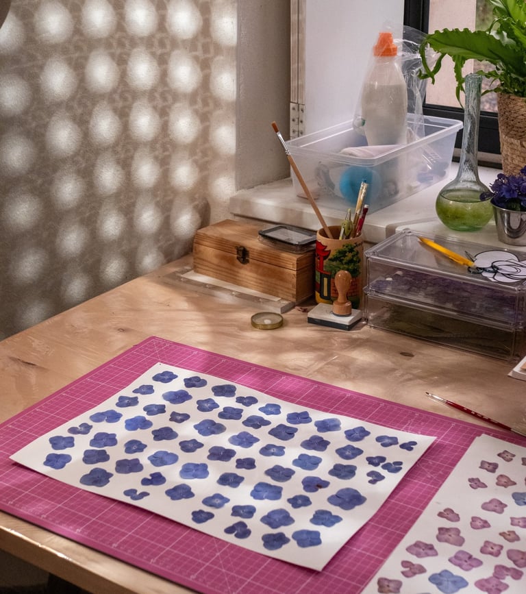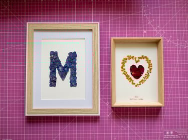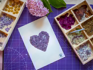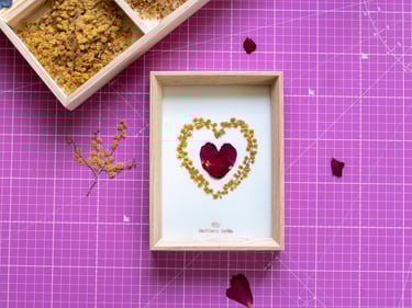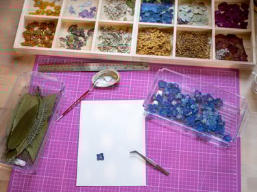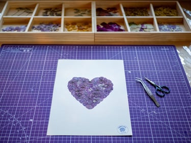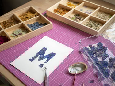 Vient ensuite la composition, moment où je joue avec les couleurs et les textures. J'aime superposer les pétales, créer des volumes, donner du relief à mes créations. Chaque herbier devient une petite sculpture végétale, où les nuances et les matières dialoguent.