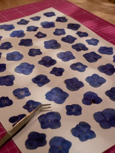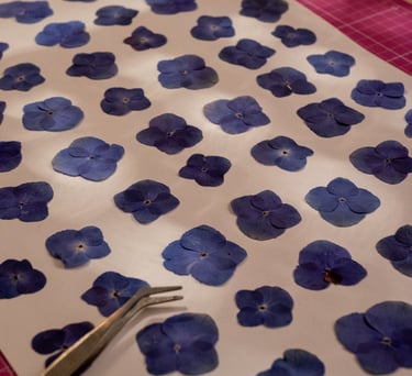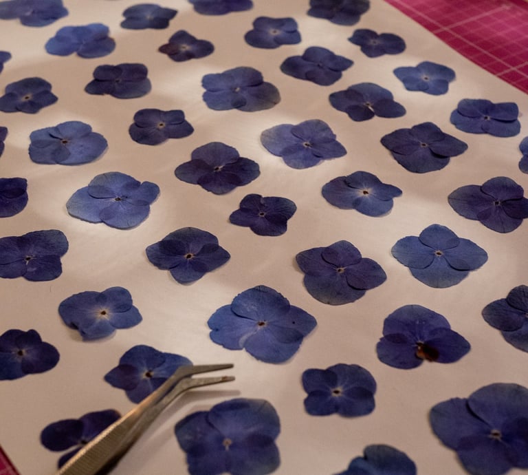 Je cultive et cueille des Hortensias dans mon jardin fleurit, que je prépare en selectionnant chaque fleurs avant de les placer délicatement dans ma presse artisanale en bois que j'ai fabriquée moi-même.
