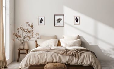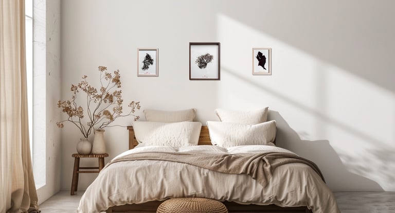 Les alguiers transforment instantanément l'atmosphère d'un intérieur. Leurs formes graphiques et organiques apportent une présence naturelle forte tout en restant épurées. Le contraste saisissant entre le noir profond, le vert lumineux ou le bordeaux chaleureux des algues et le fond crème du papier crée un impact visuel immédiat, que ce soit dans un salon contemporain, une chambre zen ou un bureau minimaliste.