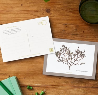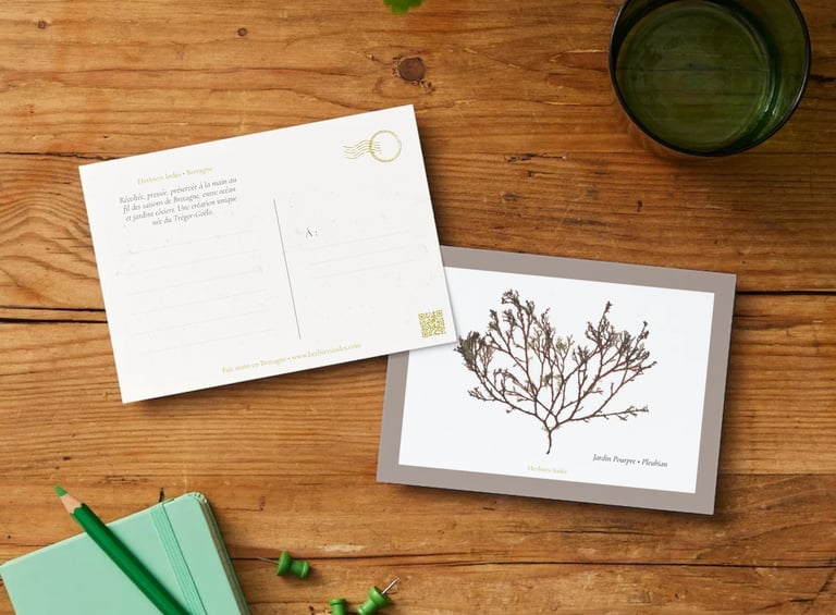Emportez un fragment de Bretagne dans votre poche. Chaque carte postale est une invitation à partager la beauté des algues et fleurs pressées, à offrir ou à collectionner.