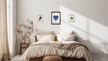 Une autre option consiste à placer l'herbier sur le mur en face du lit, pour qu'il soit visible au réveil. Imaginez ouvrir les yeux le matin et contempler immédiatement la beauté délicate d'un herbier de cœur ou les nuances océanes d'un alguier. Cette vision matinale instaure une atmosphère positive pour débuter la journée.