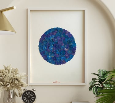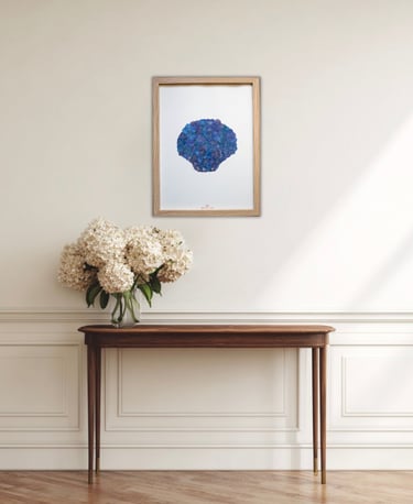 Un grand mandala d'hortensias apporte une dimension méditative et zen, parfaite pour une chambre. Ses formes circulaires et sa symétrie créent un effet apaisant et harmonieux. Les nuances de bleus iodés évoquent le calme de l'océan, favorisant la détente et le sommeil. Pour un format 30x40 cm, prévoyez une distance d'environ 20 à 30 cm au-dessus du haut de la tête de lit.