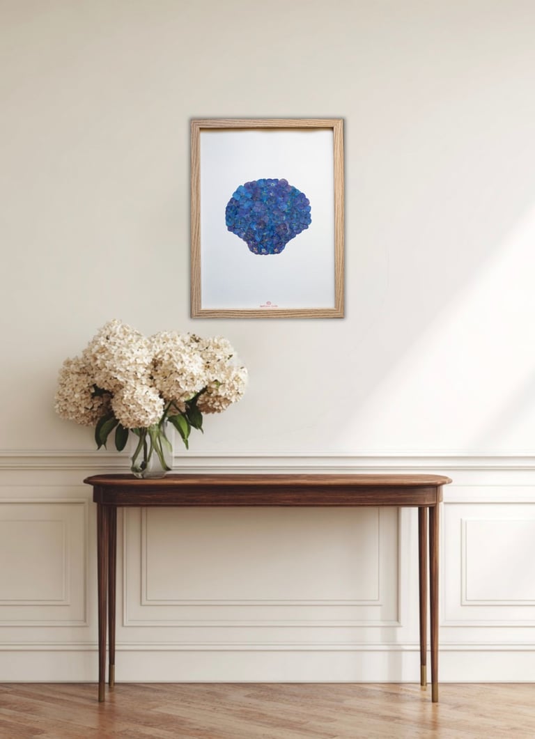 Créez une harmonie chromatique : si vous optez pour des herbiers d'hortensias, jouez sur les différentes nuances de bleus, du turquoise lumineux au bleu nuit profond. Vous pouvez également alterner herbiers floraux et alguiers marins pour créer un dialogue entre les végétaux terrestres et marins, entre les couleurs chaudes des fleurs et les tons plus froids des algues.