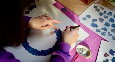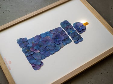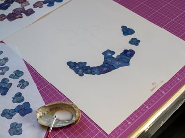Vient ensuite la composition, moment où je joue avec les couleurs et les textures. J'aime superposer les pétales, créer des volumes, donner du relief à mes créations. Chaque herbier devient une petite sculpture végétale, où les nuances et les matières dialoguent.