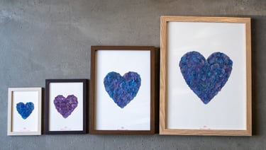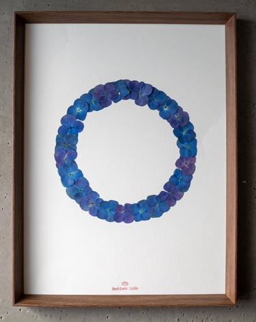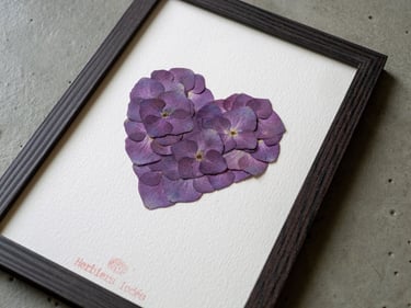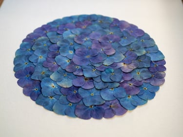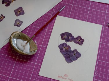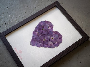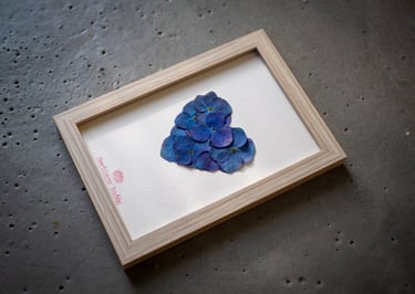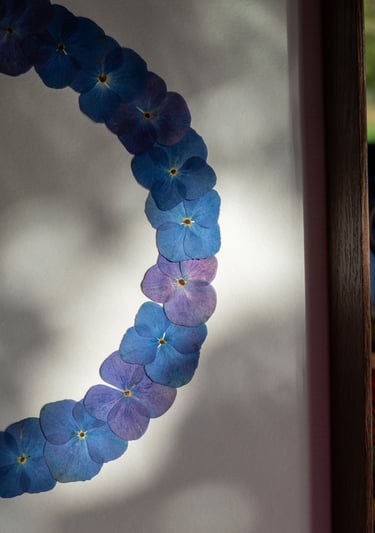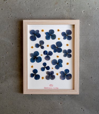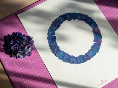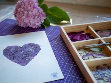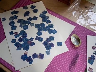 Je cultive et cueille des Hortensias dans mon jardin, que je prépare en selectionnant chaque fleurs avant de les placer délicatement dans ma presse artisanale en bois que j'ai fabriquée moi-même.