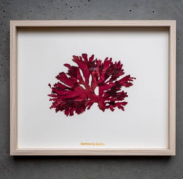 Chaque algue est récoltée à la main sur la côte de Bretagne Nord, dans le Trégor-Goëlo, lors de balades au bord du Trieux et sur l'estran à marée basse sur la presqu'île de Lézardrieux. Je sélectionne essentiellement les algues fines aux formes les plus graphiques : algues brunes aux ramifications délicates comme du corail, algues vertes éclatantes, algues filamenteuses aux textures aériennes, algues rouges aux tons profonds.