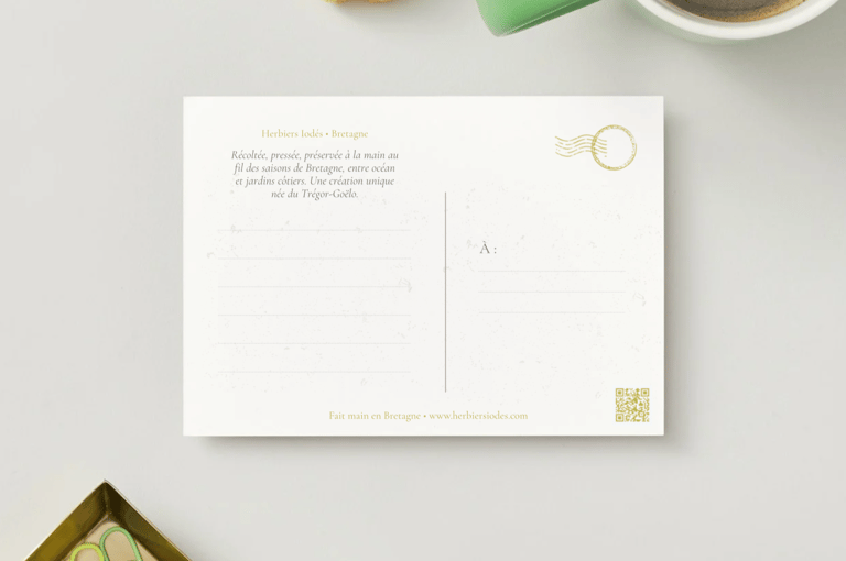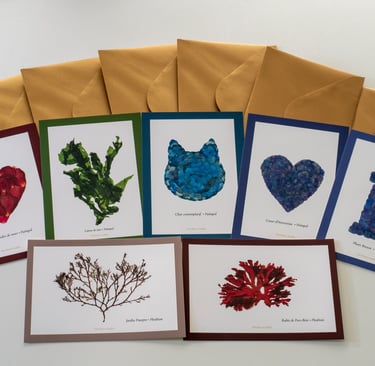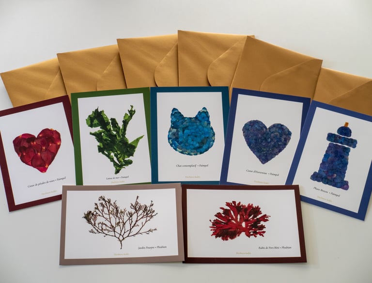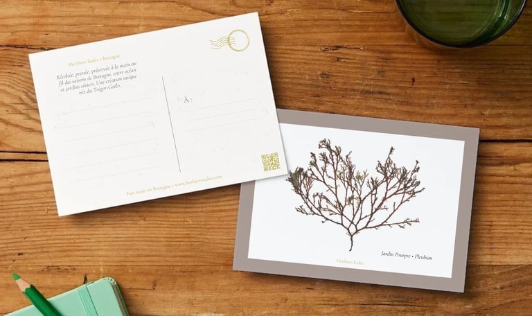 Emportez un fragment de Bretagne dans votre poche. Chaque carte postale est une invitation à partager la beauté des algues et fleurs pressées, à offrir ou à collectionner.