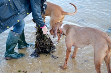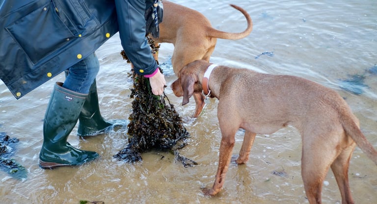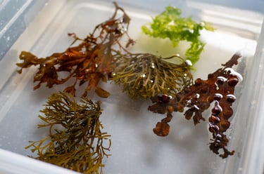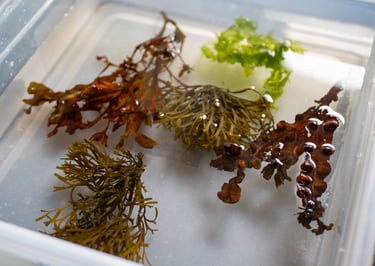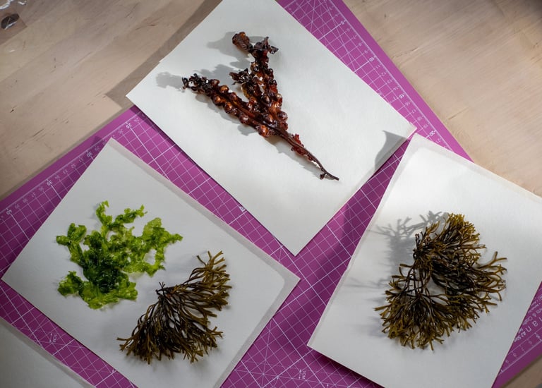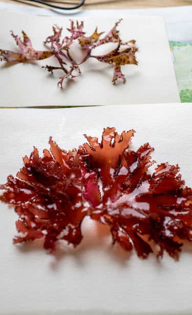Ma pratique de l'alguier commence toujours par la récolte, au rythme des marées. Sur la presqu'île de Lézardrieux, à Plougrescant, Loguivy-de-la-Mer ou le long des rochers de Paimpol, je parcours les estrans à marée basse à la recherche des plus belles algues. Cette étape demande patience et observation : toutes les algues ne conviennent pas pour la création d'alguiers.
