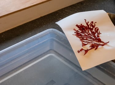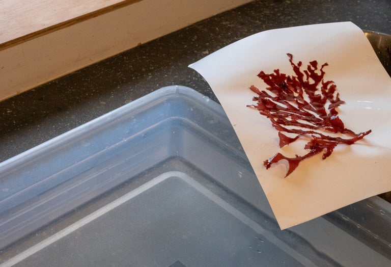 De retour à l'atelier, commence alors un processus minutieux qui s'apparente à celui utilisé par les frères Crouan, mais adapté à une visée artistique. Les algues fraîches sont rincées à l'eau douce pour éliminer le sel et les particules de sable, puis immergées dans une bassine d'eau claire. C'est dans l'eau que je dispose chaque algue sur une feuille de papier, branche par branche, en cherchant la composition la plus harmonieuse.